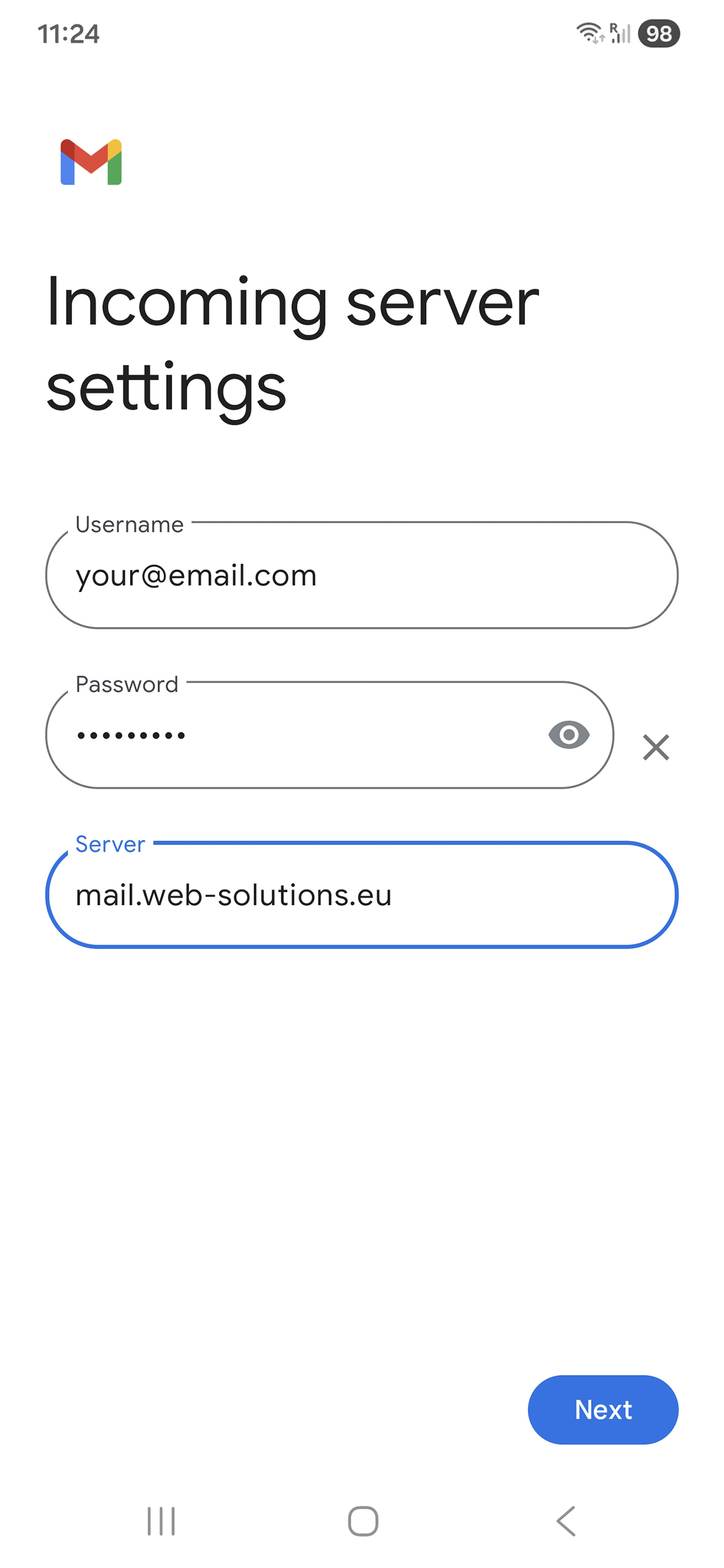 8. Change the incoming server to mail.web-solutions.eu and tap Next.