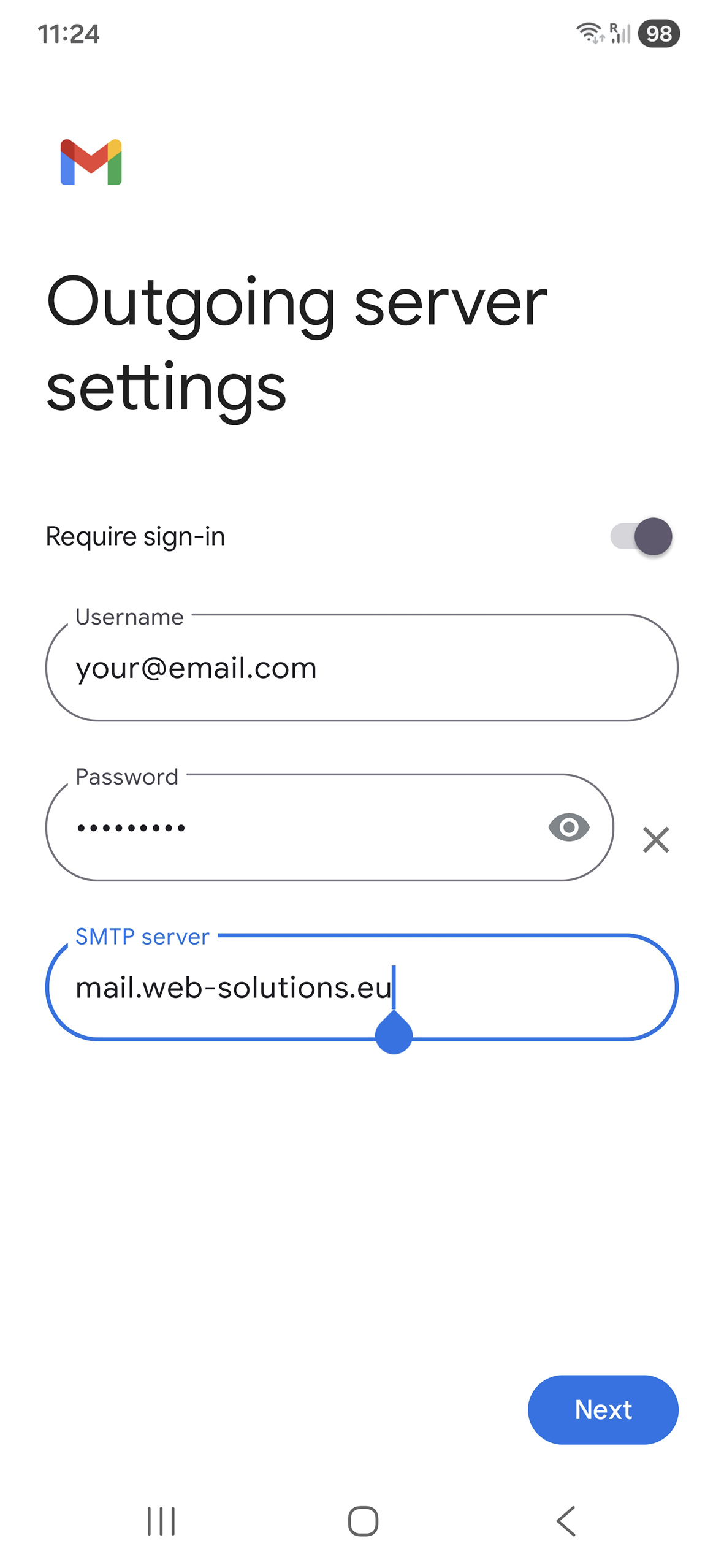 9. Change the outgoing server to mail.web-solutions.eu and tap Next.
